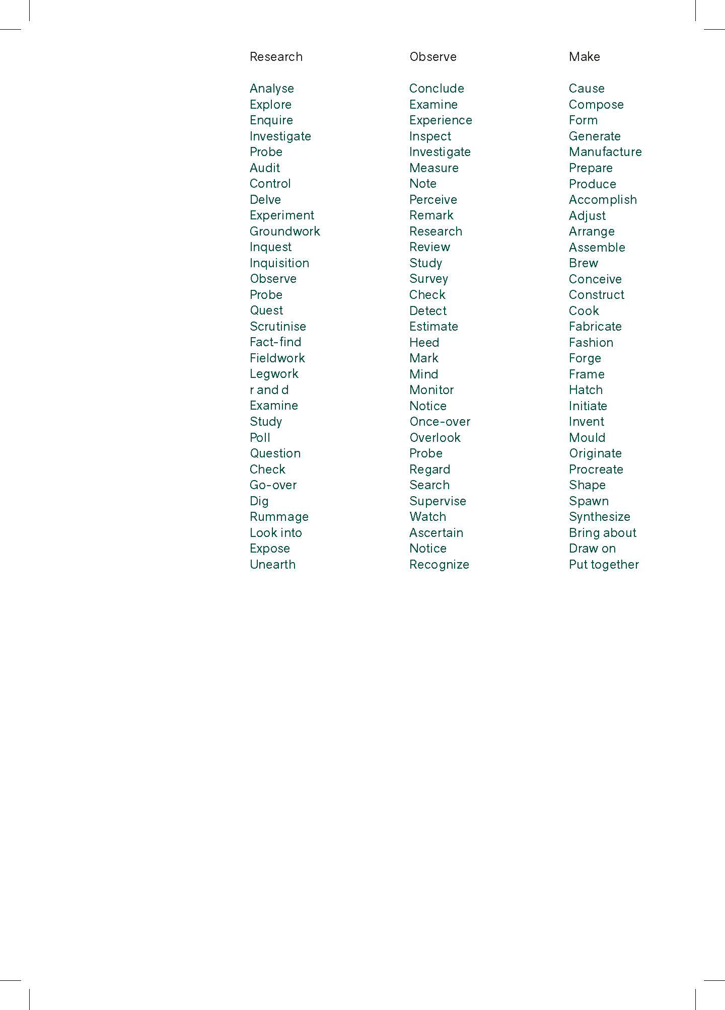 Research - Observe – Make an Alternative Manual for Architectural Education Research – Observe – Make (ROM) describes the evolution of the platform for Construction, Material & Technology (CMT), at the Institute for Art and Architecture of the Academy of Fine Arts Vienna. The CMT platform is led by Michelle Howard who used the platform to explore the didactic principles published here for the first time. These principles are seated in the conviction that greater interaction with the world around us can provide untold levels of inspiration and indeed propose solutions if we only looked closely enough. The ROM publication documents this program of studies and also forms the basis for future development. It comprises, assembled in one volume, five complementary books, which can also be read individually. After an introduction and an exposé on theory, the "elemental", "spatial" and "material" projects are introduced. The last book documents workshops, lectures and experiments.